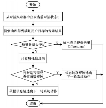 强化学习的方法通过定义五元组将当前时刻之后的状态奖励考虑进来,使得对话中系统的决策具有前瞻性(考虑后序状态奖励),能够快速选择最快抵达终止状态的最优路径,不需花费太多时间,且不同状态的奖励值可通过自定义的方式进行设定,但该方法所得的状态之间的状态值函数可能相等,所选择的路径可能是次优解;而基于属性信息熵计算策略的计算方法考虑了音乐搜索结果列表,通过当前对话状态得到对应的目标约束,进行曲库搜索,然后计算音乐属性槽的信息熵,求得考虑了当前轮次音乐搜索结果的对话决策。由于基于属性的方法需要根据检索列表进行曲库搜索,数据集的属性种类越多,响应时间越久。两种方法都有自己的特点和优势,因此本文提出基于贝尔曼方程求解的强化学习和属性信息熵相结合的对话策略算法,融合两种算法的优点,利用基于贝尔曼方程求解的强化学习算法帮助基于属性信息熵的策略计算方法筛选检索列表以缩短响应时间,利用基于属性信息熵的策略方法帮助基于贝尔曼方程求解的强化学习算法排除次优解。本文根据基于贝尔曼方程求解的强化学习和属性信息熵相结合的对话策略算法对对话策略模块进行建模,算法的流程如图 2所示。