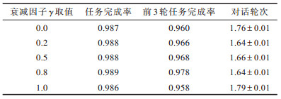 从表 1的实验结果可以看出,虽然衰减因子γ对于融合强化学习算法的性能具有影响,但无论衰减因子γ取什么值,其结果都好于系统随机引导以及基于规则的对话策略,且与基于信息熵的对话策略的性能接近。当γ取值为0.8时融合强化学习算法结果最好,为方便比较,本文设定衰减因子γ取值为0.8。