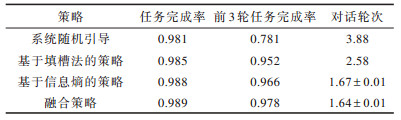 2)与系统随机引导的对话策略相比,基于人工制定属性槽优先级的对话策略能够显著减少完成音乐搜索任务所需的对话轮次(从3.88次到2.58次),这是因为人工定义属性槽的优先级,将领域知识通过制定规则的方式添加到算法中,从而提升了对话策略的智能程度。