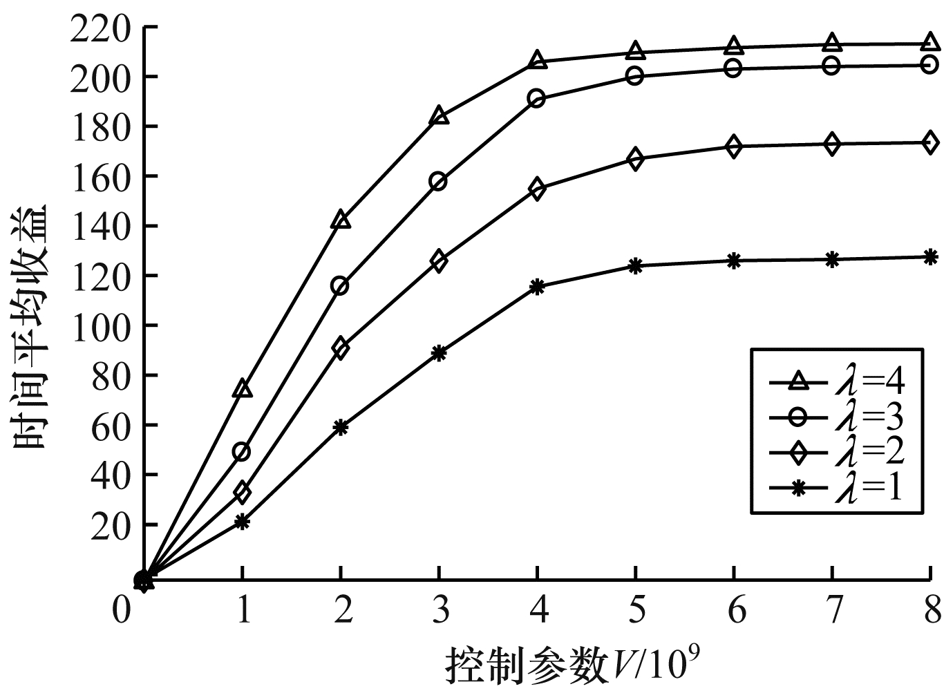 | 图 3 系统时间平均收益和任务到达率的关系 Fig. 3 The relationship between system time average profit and task arrival rate | |