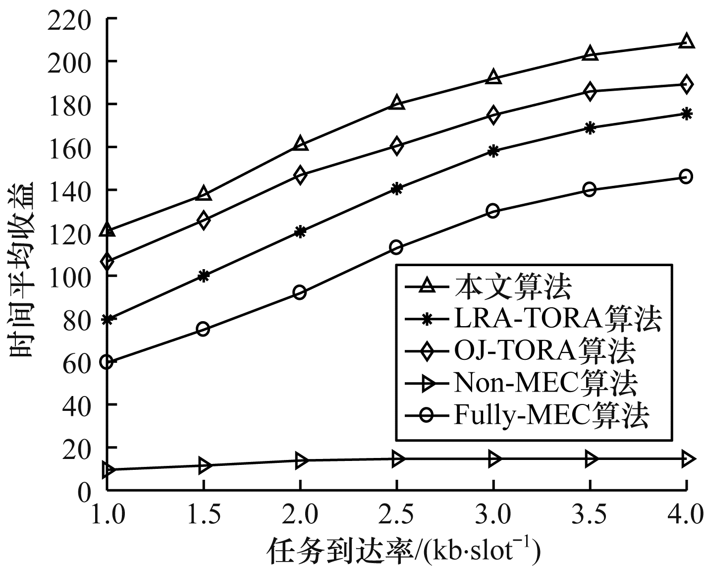 图 3所示为不同算法下任务到达率与系统时间平均收益的关系。从图 3可以看出,系统时间平均收益随着任务到达率的增大而增大,而且对于任意任务到达率,本文算法在所有算法中收益最高。这是因为本文综合考虑功率、带宽资源以及计算资源并进行优化,能在满足用户QoS需求的同时合理地分配任务资源。