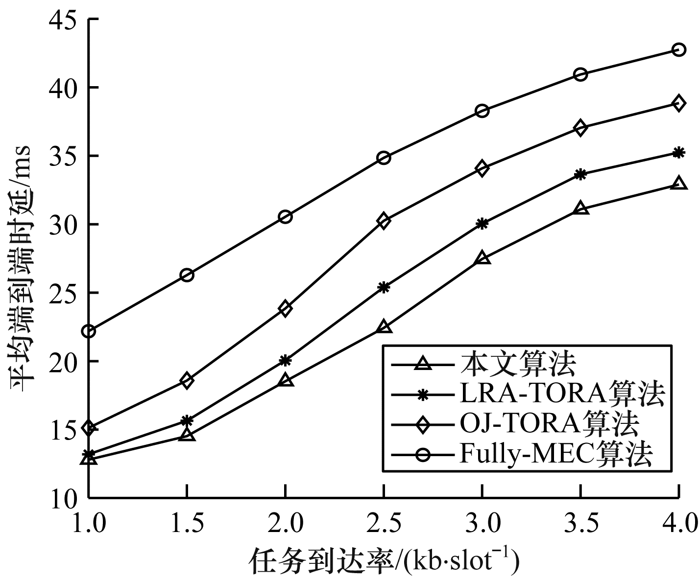 | 图 4 平均端到端时延和任务到达率的关系 Fig. 4 The relationship between average end-to-end delay and task arrival rate | |