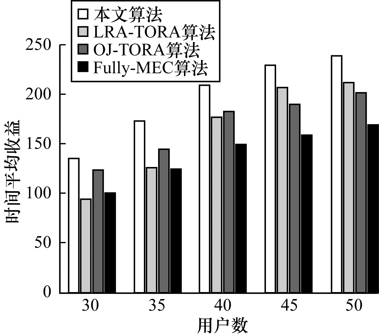 图 5所示为不同算法下系统时间平均收益与用户数的关系,从图 5可以看出,4种算法的系统时间平均收益都随用户数的增加而增加,但是当用户数大于40后,收益的增长速率变缓。由于本文算法在分配带宽资源时根据用户实际需求动态分配而非均等划分,提高了系统任务的收入,另一方面,该算法根据任务队列状态对MEC服务器的计算资源进行分配,提高了资源利用率,节约了系统成本。因此,本文算法在系统时间平均收益上明显优于其他3种算法。