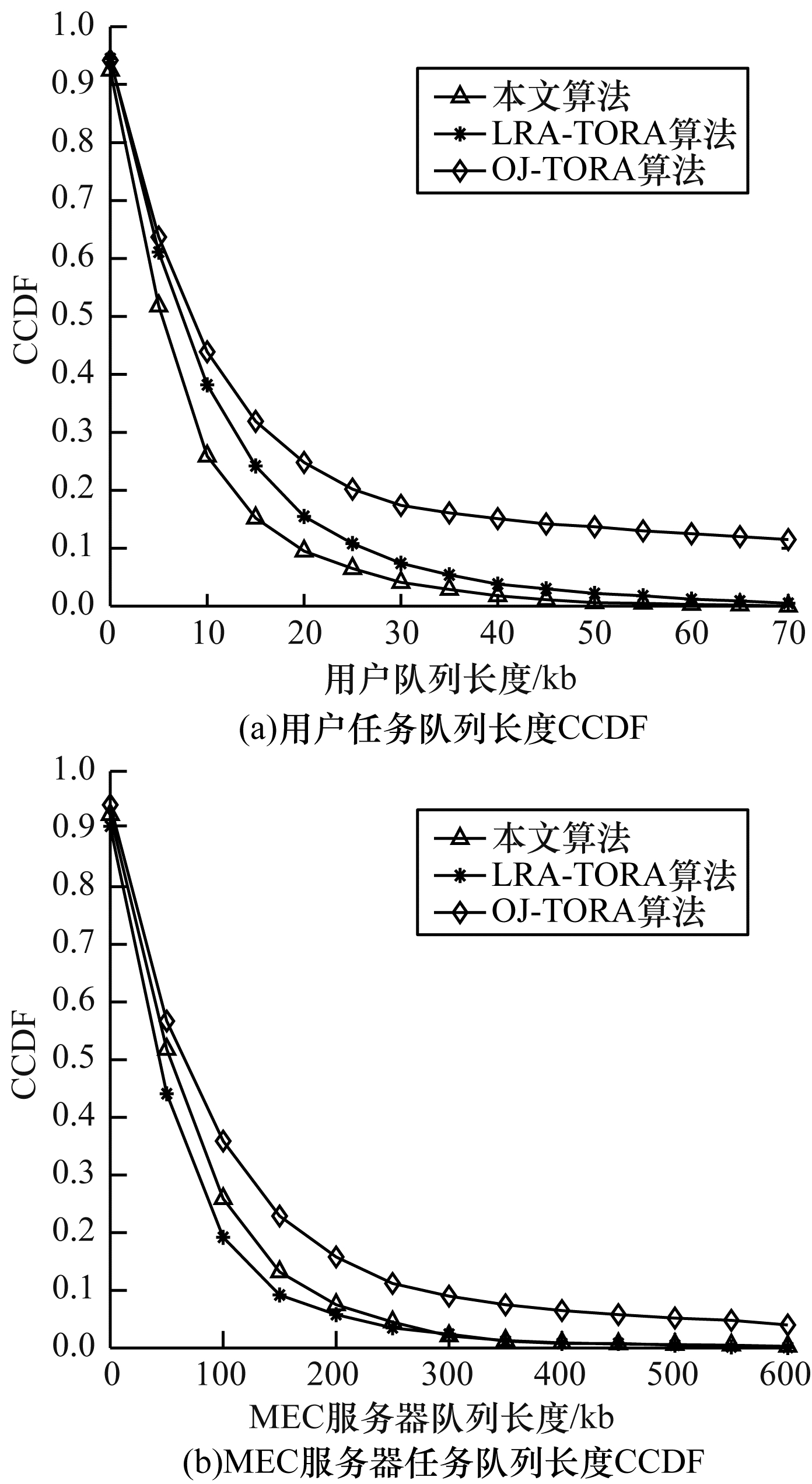 由于队列长度是评估用户时延和数据可靠性的关键因素,因此本文对任务队列长度的互补累积分布函数(CCDF)进行仿真,并将本文算法与LRA-TORA和OJ-TORA算法进行对比。当任务到达率为3 kb/slot时,定义用户队列阈值和MEC服务器队列阈值分别为