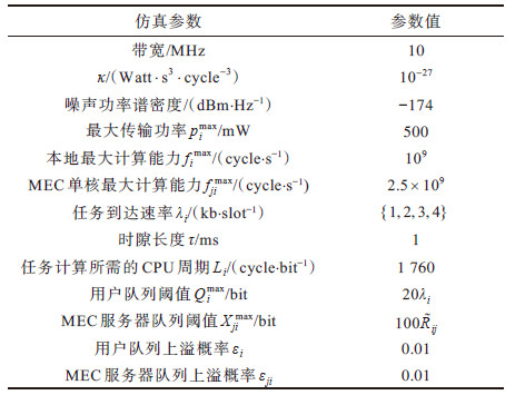 图 2所示为用户数为40时MEC系统时间平均收益随控制参数V的变化情况。从图 2可以看出,时间平均收益随控制参数V的增加而逐渐增大并趋于平稳,这是因为在Lyapunov优化过程中,控制参数V越大,则系统越倾向于优化罚函数,即系统时间平均收益,该结果验证了本文所提算法的有效性。