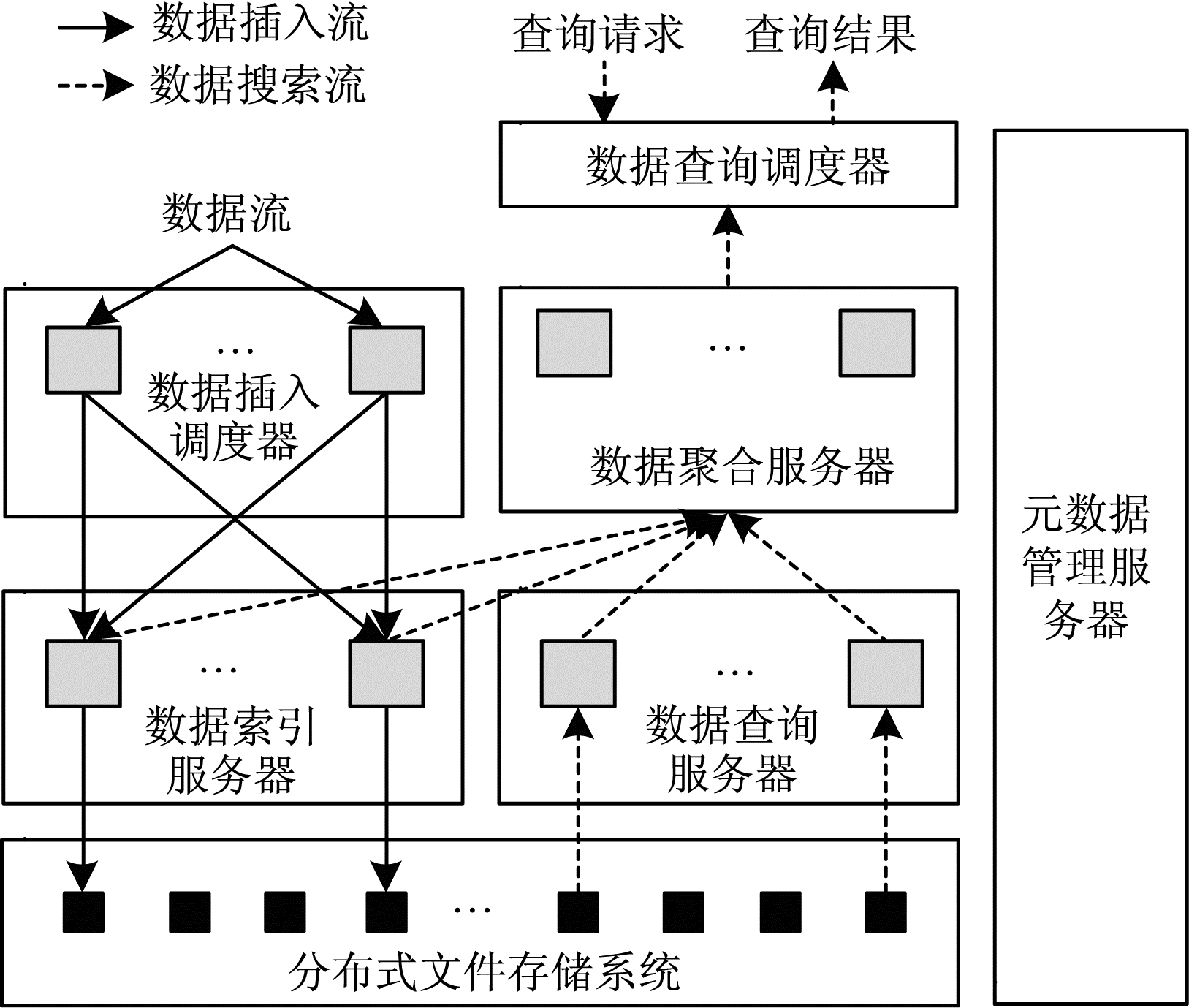 本文模型支持多用户查询的并发处理,查询调度层根据查询标准和元数据服务层的信息将用户查询转换为独立子查询,并在索引服务层和查询服务层间并行执行,然后将查询结果返回到各自聚合服务器进行聚合函数处理,再合并返回给对应用户。下文分别介绍高吞吐量数据插入中使用的数据索引存储方法(见图 1中实线指示的路线)和实时查询处理方法(见图 1中虚线指示的路线)。