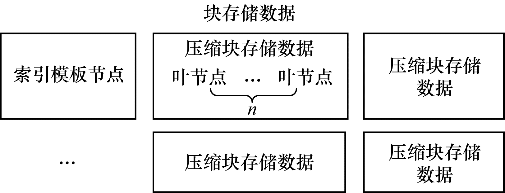数据层采用分组并压缩的布局形式从左到右有序存储模板B+树全部叶子节点,根据预设的组容量k,从最左侧叶节点开始以k个为一组进行压缩,生成压缩数据块,一直压缩到最右侧叶节点。每个压缩数据块互相独立,并记录组内叶节点中数据元组的键值范围,从而使压缩数据块在满足查询条件覆盖范围的同时,能根据偏移量进行针对性读取,以避免读取整个数据块。