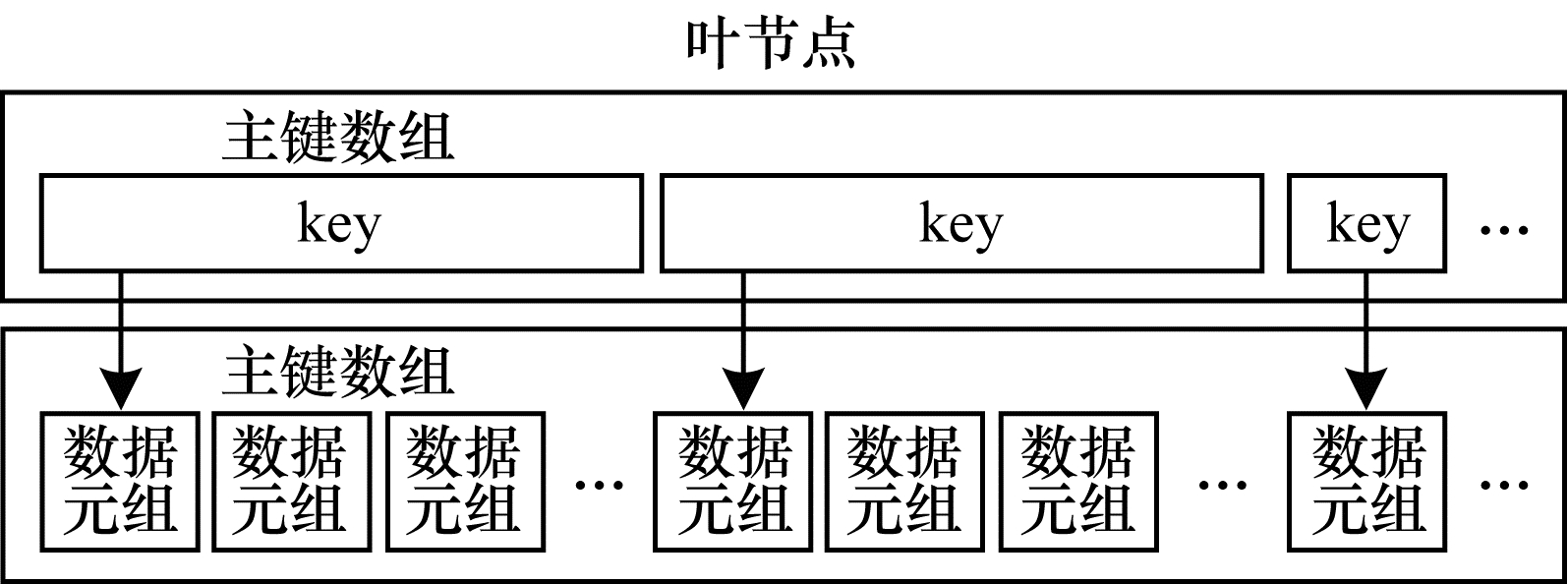 压缩数据块中叶节点布局包括索引部分和数据部分,如图 3所示。索引部分为一个key数组,包含与数据元组对应的一个数组偏移量。数据部分为一个数据元组数组,其存储了流入系统的原始数据元素。在获取叶节点后,使用二分法在索引部分key数组中找到数据元组对应的偏移量,然后根据偏移量找到数据部分对应的数据元组,即为查询结果。