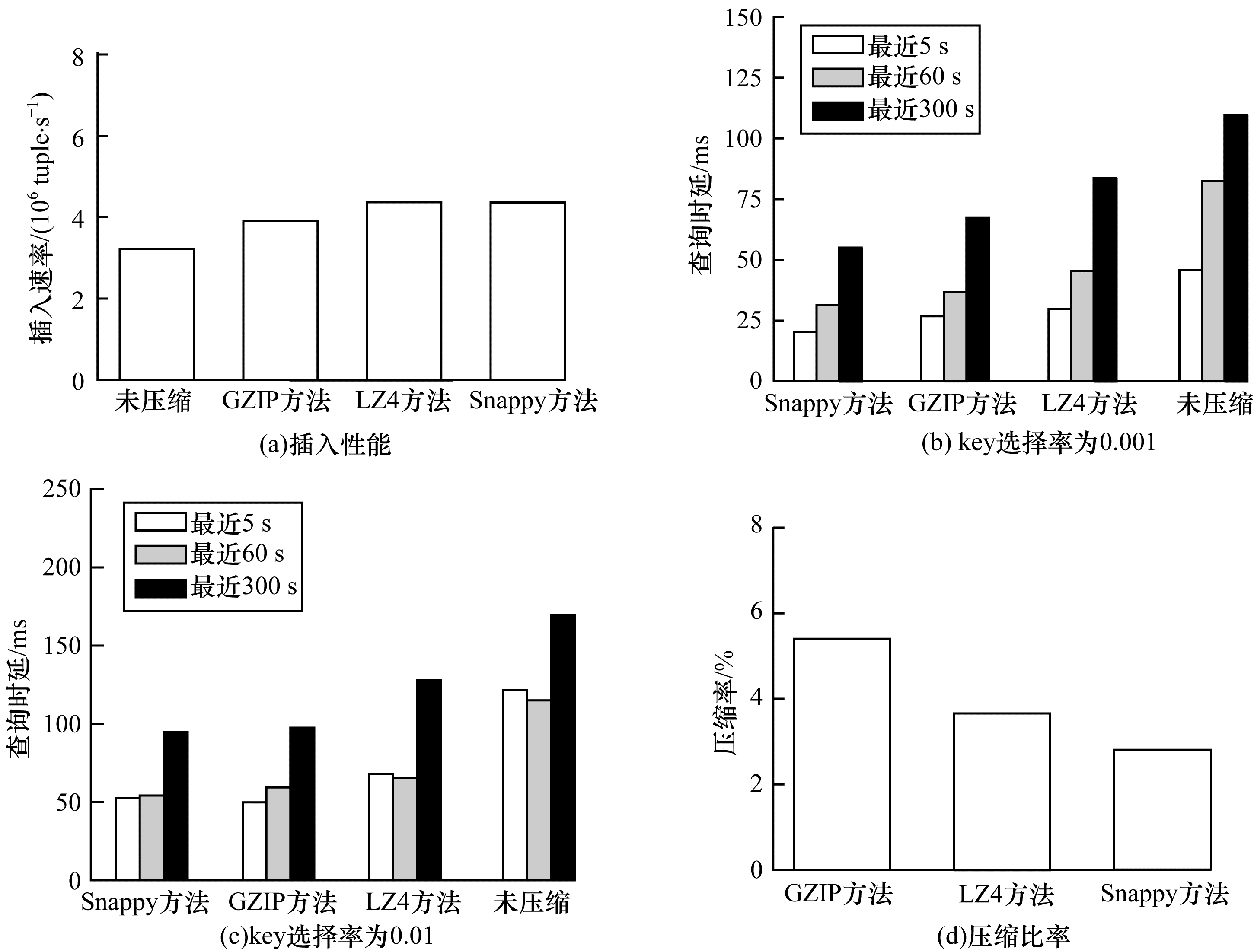 由图 4(b)和图 4(c)可以看出,在不同的key选择率和不同查询时间范围(距离请求最近5 s、60 s和300 s)内,查询时延在进行数据压缩处理后明显降低。根据查询键值范围,在元数据层找到StoreFile压缩时数据层每个分组偏移量和组内每个叶节点偏移量,就可跳过无效检索数据,仅读取指定叶节点数据,从而降低时延。此外,Snappy压缩方法在数据插入和查询时有较好的性能表现,其原因是该压缩方法适合大量数据传输场景,数据压缩速度是其他压缩方法的1.5倍~1.7倍,而本文模型涉及到数据的内存索引,需压缩存储到文件系统并进行实时数据访问,要求数据传输通信效率较高,且Snappy压缩方法不会占用大量CPU,当本文模型混合负载复杂流数据进行统计聚合工作时,在资源方面对任务影响较小,保证了查询时延的稳定性。