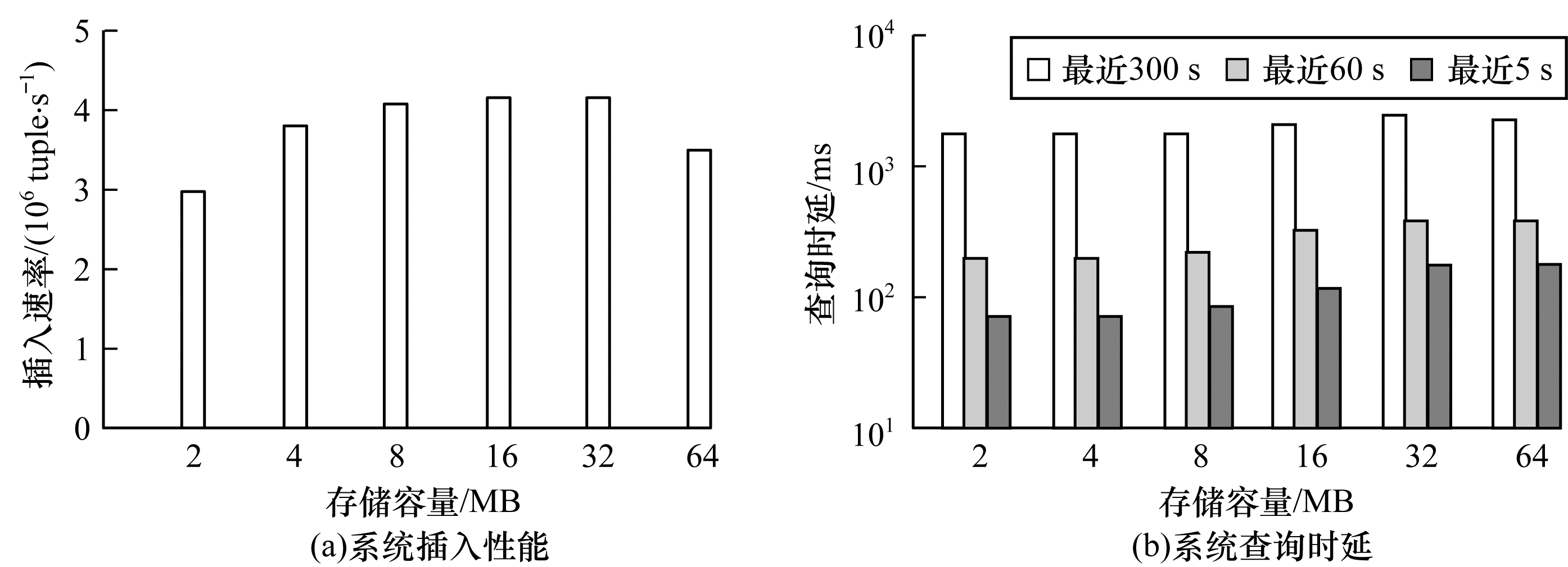 图 5为不同StoreFile存储容量和键范围对本文模型的数据压缩存储性能影响的评估结果。由图 5(a)可以看出,当StoreFile容量小于32 MB时,模型数据写入速率随容量增大而提高,其原因是降低内存索引服务器中StoreFile达到阈值后落盘到文件系统的频率,缩短系统磁盘I/O读写时间与数据插入索引停止时间(写文件时该内存索引服务器的数据插入索引会暂停,直到数据完成在文件系统的写入)。当StoreFile容量超过32 MB后,模型数据写入速率随容量增大而降低,这是因为StoreFile所需压缩存储时间成本较高,导致数据插入索引工作停滞状态过长。图 5(b)为本文模型在不同键范围与StoreFile容量下查询时延的变化情况。可以看出,查询时延随着StoreFile容量增大而升高,其原因是每个StoreFile均有不同的键值范围和时间域范围,而根据压缩存储形式可以仅读取StoreFile中指定的一系列叶节点以及叶节点中指定的部分数据,因此,对于给定键值范围的独立子查询,其数据读取范围与StoreFile容量成正比例增长。当StoreFile容量接近8 MB时,数据查询时延趋于稳定,这是因为当StoreFile容量较小时,数据压缩比较低,压缩所需时间和压缩后StoreFile的大小变化较小,而CephFS底层为OSD块存储形式,其读取块数据存在访问时延,当StoreFile容量较小时,该访问时延会占较大比例,使得查询时延趋于平稳。由上述分析可知,当StoreFile容量取值为8 MB时,在存储和查询上具有更优的数据压缩性能。