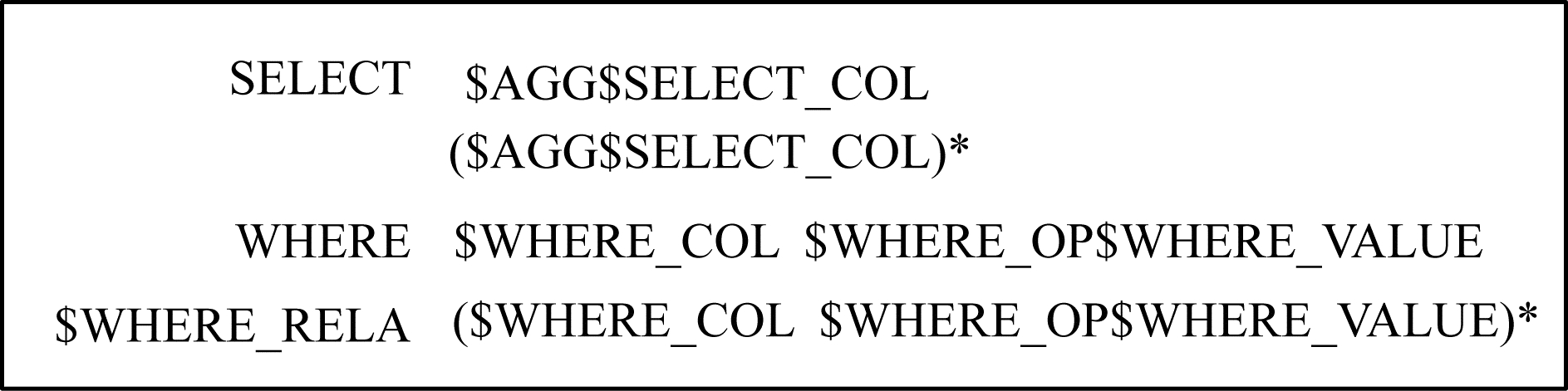 本文将序列生成任务转化为多个分类任务,通过填充SQL草图生成SQL查询。该中文数据集的SQL查询对应的SQL草图如图 2所示,草图的每个槽对应不同子任务。以$开头的标记表示槽标记,$后面的名称表示需要预测的类型。其中:$AGG表示模型预测SQL查询的聚合函数,取值集合包括{' ','MAX','MIN','COUNT','SUM','AVG'};$SELECT_COL和$WHERE_COL表示模型需要预测的数据库表列名;$WHERE_RELA表示where子句的关系,包括{' ','and','or'};$WHERE_OP表示SQL查询的操作符,包括{'=',' > ',' < '};$WHERE_VAL表示从问句中生成的SQL查询条件值;(…)*表示子句的数量是零个或多个。