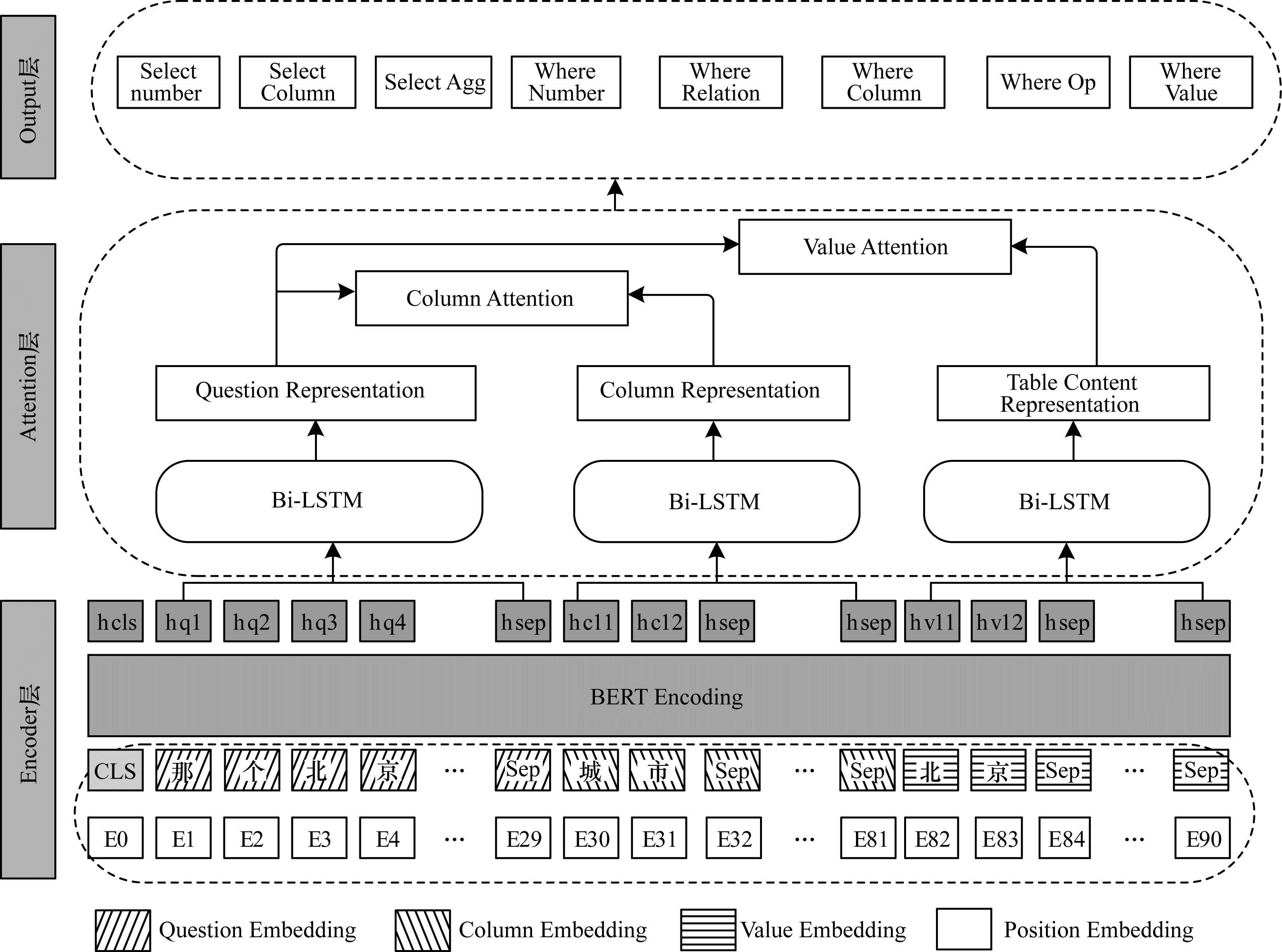 在SQLova框架下,将模型分成Encoder层、Attention层以及Ouput层三部分,具体结构如图 3所示。在Encoder层,SQLova将问句和表列名作为Bert预训练模型的输入,在SQLova模型的基础上将相关表内容作为Bert的输入;在Attention层,SQLova通过Column Attention得到问句表达式,利用Value Attention将表内容的信息融入问句的表达式中;在Output层,为了更好地预测Where Column和Where Value子任务,将基于表内容的问句表达式作为额外输入。