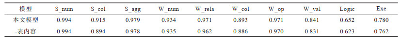 表 2给出不同模型在WikiSQL验证集和测试集上的实验结果。从表 2可以看出,本文模型的准确率明显高于表中前5个模型。针对SQLova的模型,本文获取到SQLova源码得到的模型由于不知道SQLova具体的参数,实验结果比原文给出的准确率低。本文模型在验证集上的Logic Form比SQLova高出0.18,在测试集高出0.15;在验证集上的Execution Accuracy比SQLova模型高出0.14,在测试集高出0.14。该结果表明结合表内容和表结构可以有效地提高SQL生成的准确率。