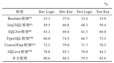 3 实验结果与分析 3.1 数据集和评估方法本文分别在追一公司发布的中文数据集和WikiSQL数据集进行测试。WikiSQL数据集是ZHONG等人[1]发布的手工数据集,被广泛应用于NL2SQL深度学习模型,该数据集拥有80 000多条训练数据以及对应的20 000多张数据库表。中文数据集共有50 000多条数据,与WikiSQL不同的是,中文数据集的SQL查询中Select子句的表列名可以是多个,另外,Where子句之间的关系不是默认的“and”关系,其条件数量以多个为主。本文使用Logic Form Accuracy(Logic)和Execution Accuracy(Exe)两个指标评估模型性能,其中,Logic Form Accuracy是指生成的SQL查询与数据集的SQL真值比对的准确率,Execution Accuracy是指生成的SQL语句与数据库的SQL语句在数据库执行完查询结果后进行比对的准确率。