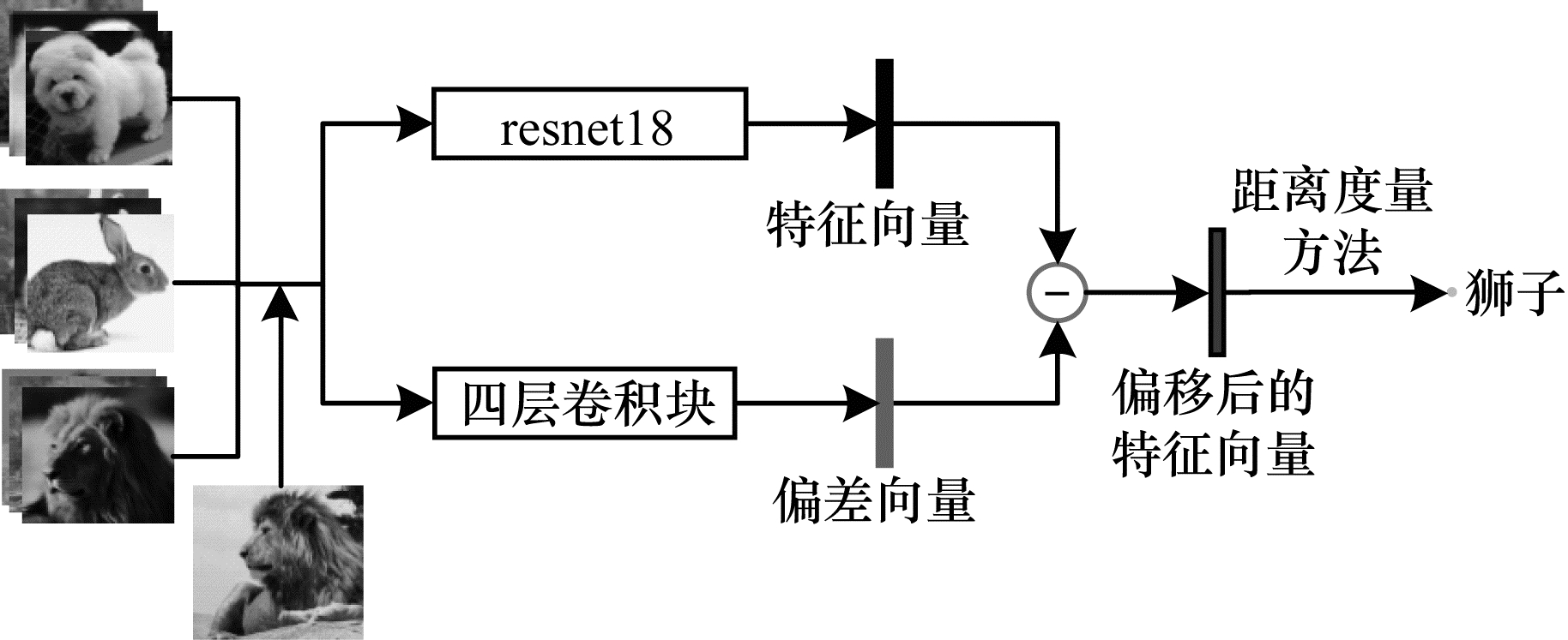 由于基于距离度量的小样本学习方法均在特征空间中对样本特征分布关系进行分析,因此特征空间的质量与模型最终效果关联密切。为减小样本特征之间的类内距离,降低对样本类别预测的难度,本文构建一种具有双路结构的特征聚合网络,并提出一种综合损失函数。结合综合损失函数,具有双路网络结构的特征聚合网络可将样本映射到同类样本特征更为聚集的特征空间中,以提升样本类别的分类效果。