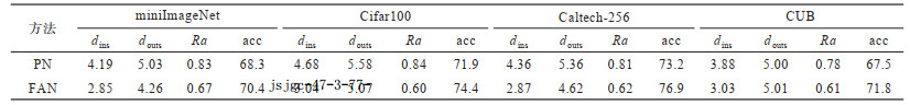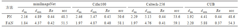 实验 1 本文所提出的特征聚合网络可将样本映射为类内分布更紧凑的特征向量,为验证这一理论,此处使用类内样本距离均值与类原型距离均值作为指标衡量模型性能。具体来说,假设测试过程中共进行q次采样,每次测试过程有p类,每类有r个测试样本,则在每次测试过程中,每个类别的类内样本特征向量之间共有r(r - 1)/2条无向边,因此在整个测试过程中共计有q×p×r(r - 1)/2条无向边。由于每条边的长度表示两个同类样本之间的欧式距离,因此可计算得到整个测试过程中所有同一采样过程中类内样本两两之间的欧式距离平均值dins,这一平均值可作为类内距离使用;同理,也可通过计算获得所有同一采样过程中类原型两两之间的欧式距离平均值douts,并使用该值度量特征空间中的类间距离。由于在一个好的特征空间中,特征向量的分布具有类内距离小、类间距离大的特性,因此可使用Ra = dins /douts作为衡量特征提取器性能的指标,当Ra越小时特征提取器性能越好。
