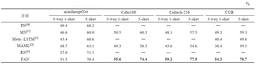 实验 2 为验证本文整体方法的有效性,分别在上述4个数据集上对比了多种类型的具有代表性的相关方法,包括匹配网络MN[15]、原型网络PN[16]、关系网络RN[21]、MAML[13]和元学习LSTM[11]。本文所提出的相关方法实验结果数据,由训练过程间隙验证正确率最高的优化模型经5次测试并取其均值得到,参与对比的其他方法实验结果来自于对应文献,经实验得到表 3所示的结果。