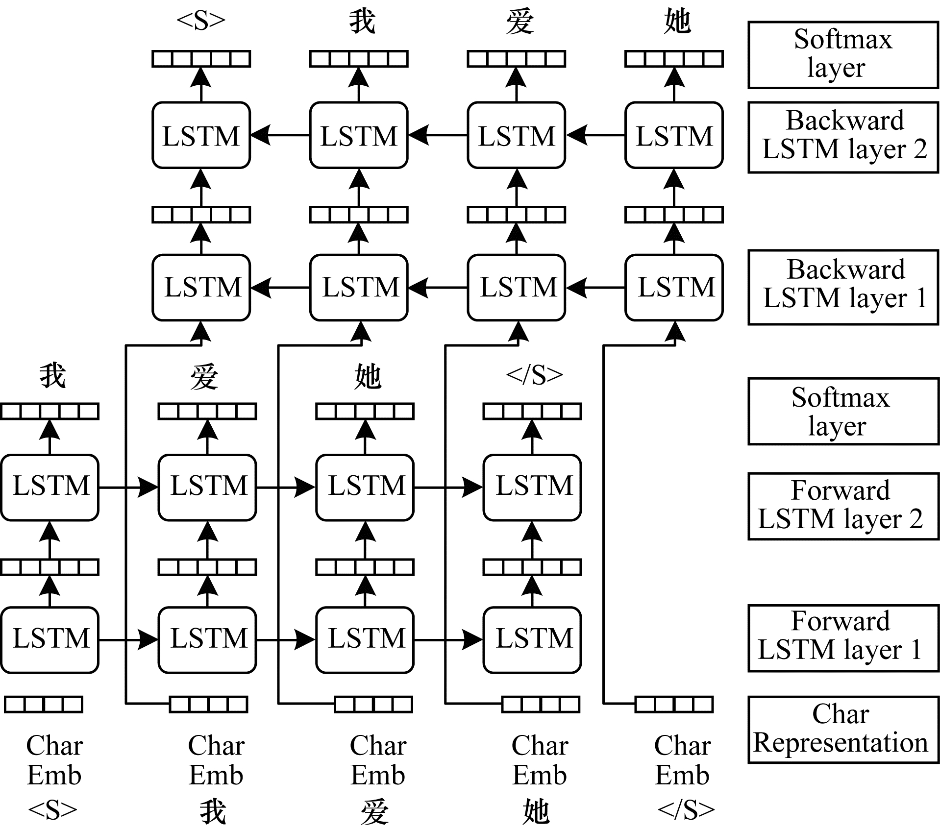 前向语言模型和后向语言模型互相独立,即参数不共享。同时,较低的层可以学到更多的语法特征,而较高的层能够学习上下文特征。因此,本文前向语言模型和后向语言模型均采用两层LSTM堆叠的结构,如图 2所示。