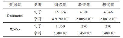 本文实验数据分为无标注数据和命名实体识别数据2类。对于无标注数据,使用Gigaword(https://catalog.ldc.upenn.edu/LDC2003T09)训练基于word2vec的上下文无关字向量和语言模型。对于命名实体识别数据,为了从不同领域评估本文模型的性能,选取来自新闻领域的数据集Ontonotes和社交媒体领域的数据集Weibo,2个数据集的句子数和字数统计如表 1所示。