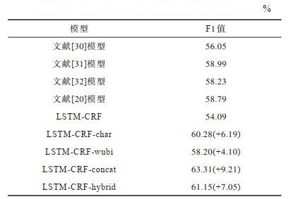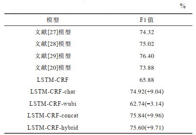 5)LSTM-CRF-hybrid:在baseline的基础上,输入增加基于字和五笔的混合语言模型得到的上下文相关字向量,对应本文所提第二种结合五笔的上下文相关字向量表示,即输入为