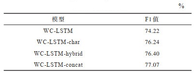 4.2.1 五笔信息与WC-LSTM相结合对识别结果的影响基于字的命名实体识别方法虽然取得了较好的效果,但是其未利用句子中词的信息。词的边界往往也是命名实体的边界,词的边界信息可以帮助基于字的命名实体识别方法确定命名实体的边界。文献[33]提出一种可以同时整合字和词信息的WC-LSTM(Word-Character LSTM)模型。为了进一步验证本文所提方法的有效性,在WC-LSTM模型的输入中增加结合五笔的上下文相关字向量表示,从而同时对五笔、字和词的多个层面进行特征表示。