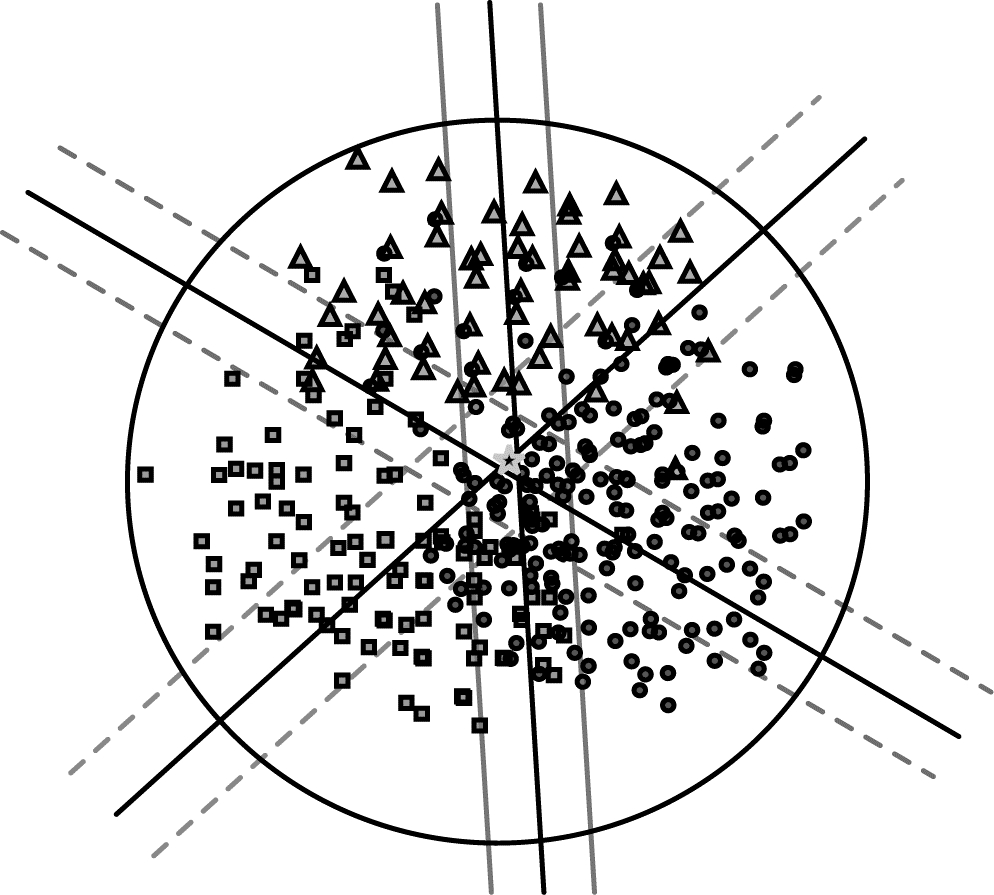 | 图 2 基站A各扇区之间的超平面及对应的最大间隔平行线 Fig. 2 The hyperplane between the sectors of base station A and the corresponding parallel lines with maximum spacing | |