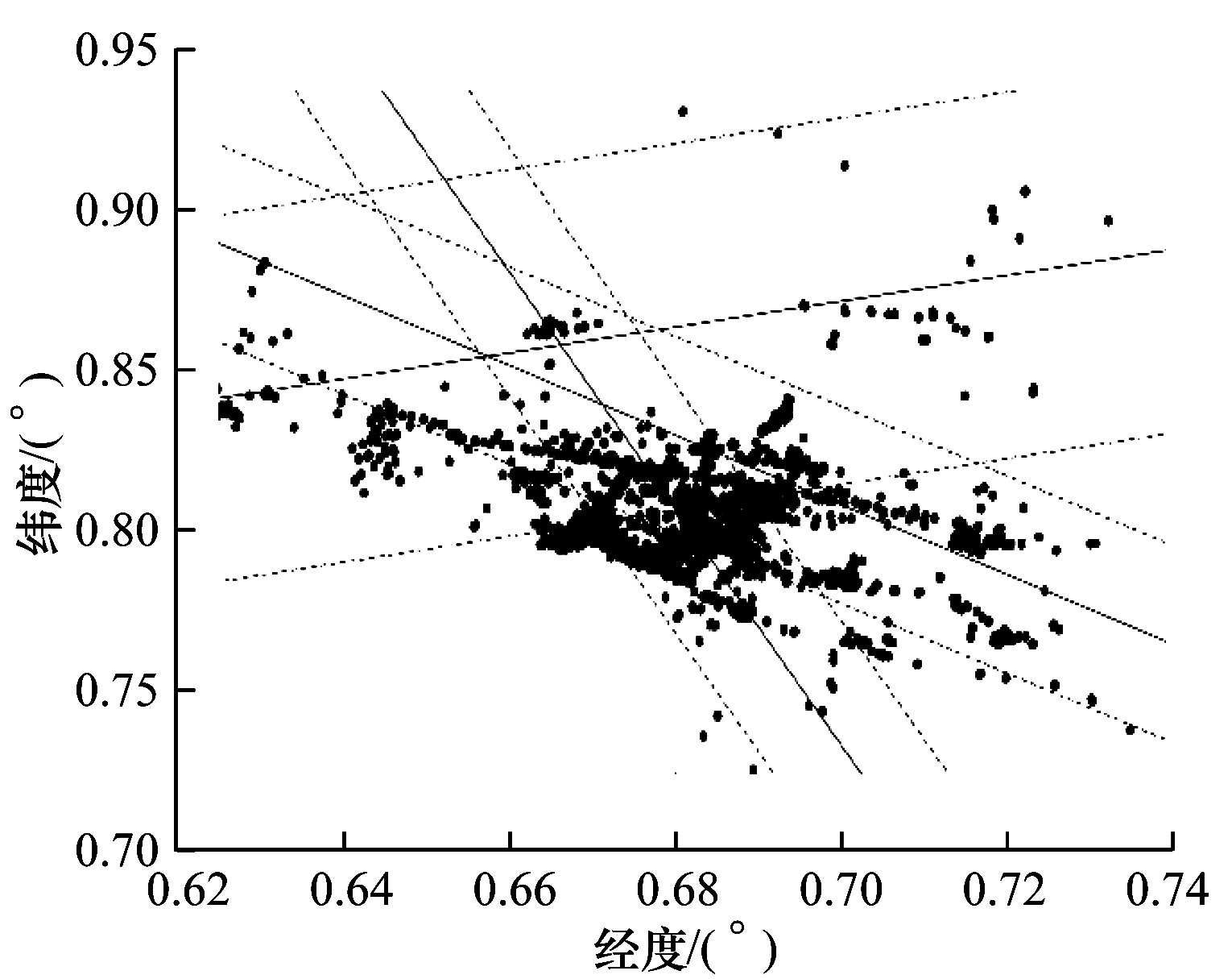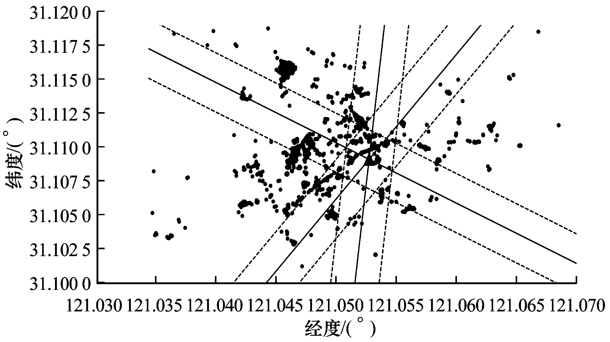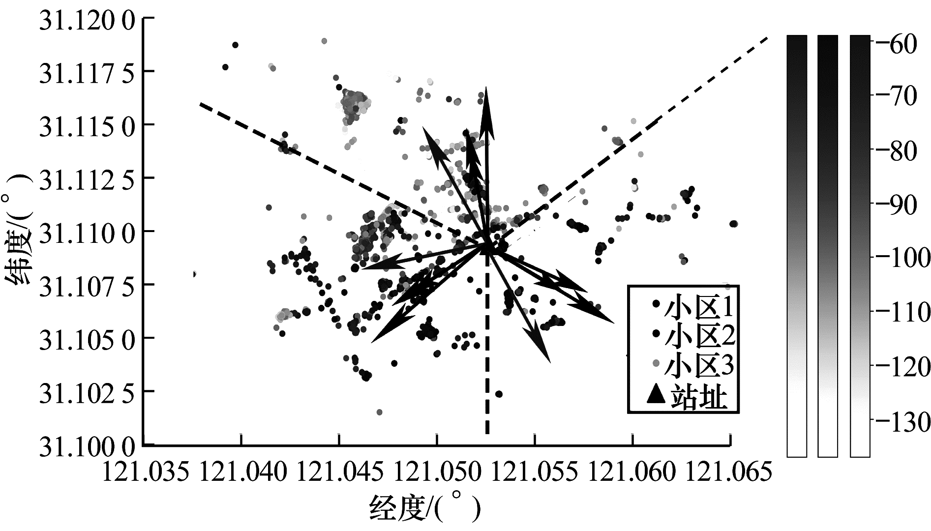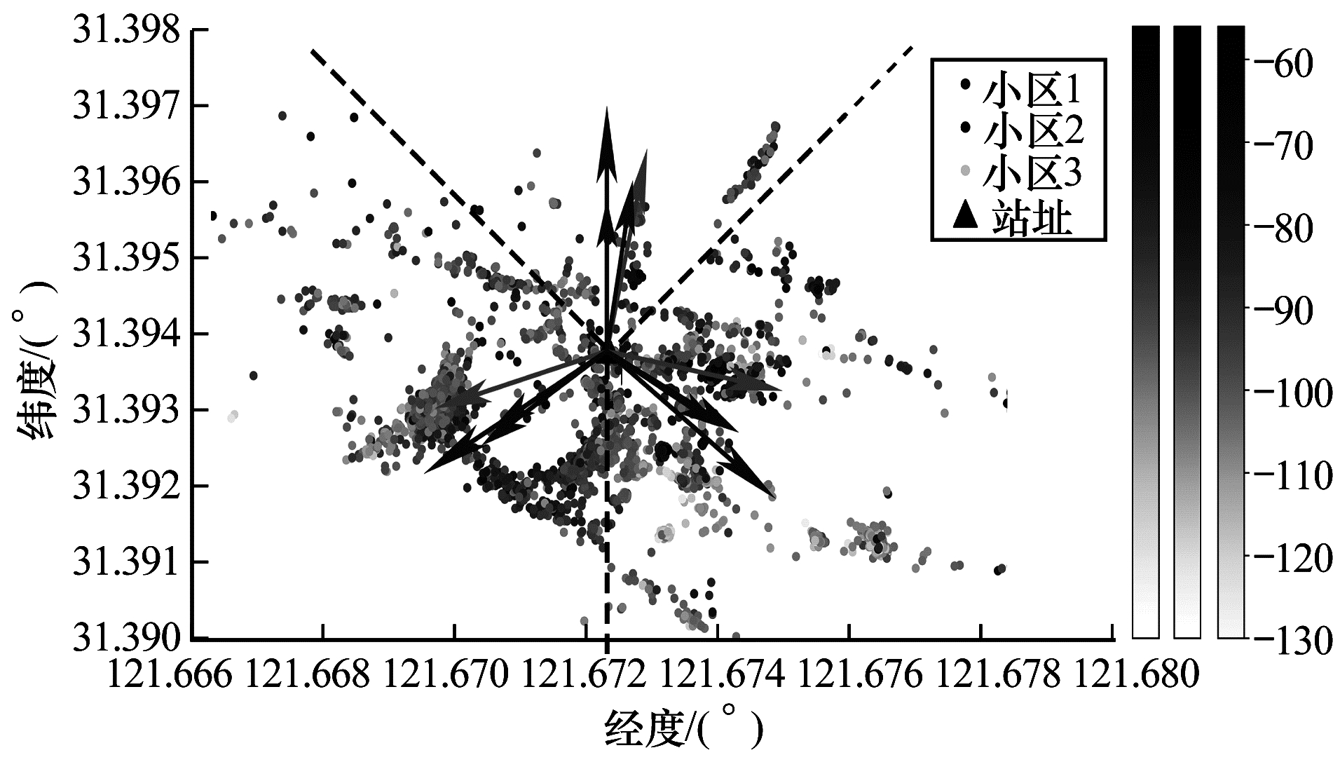 文献[2]基于MR数据,采用线性回归方法估计扇区方向角。基于传播模型估算采样点到基站的距离,根据样本分布将覆盖区域进行栅格化,取各栅格内场强最强的若干采样点计算其均值,筛选出大于均值的样本进行线性回归分析,将不同栅格内的样本拟合成一条直线,从而求解方向角。