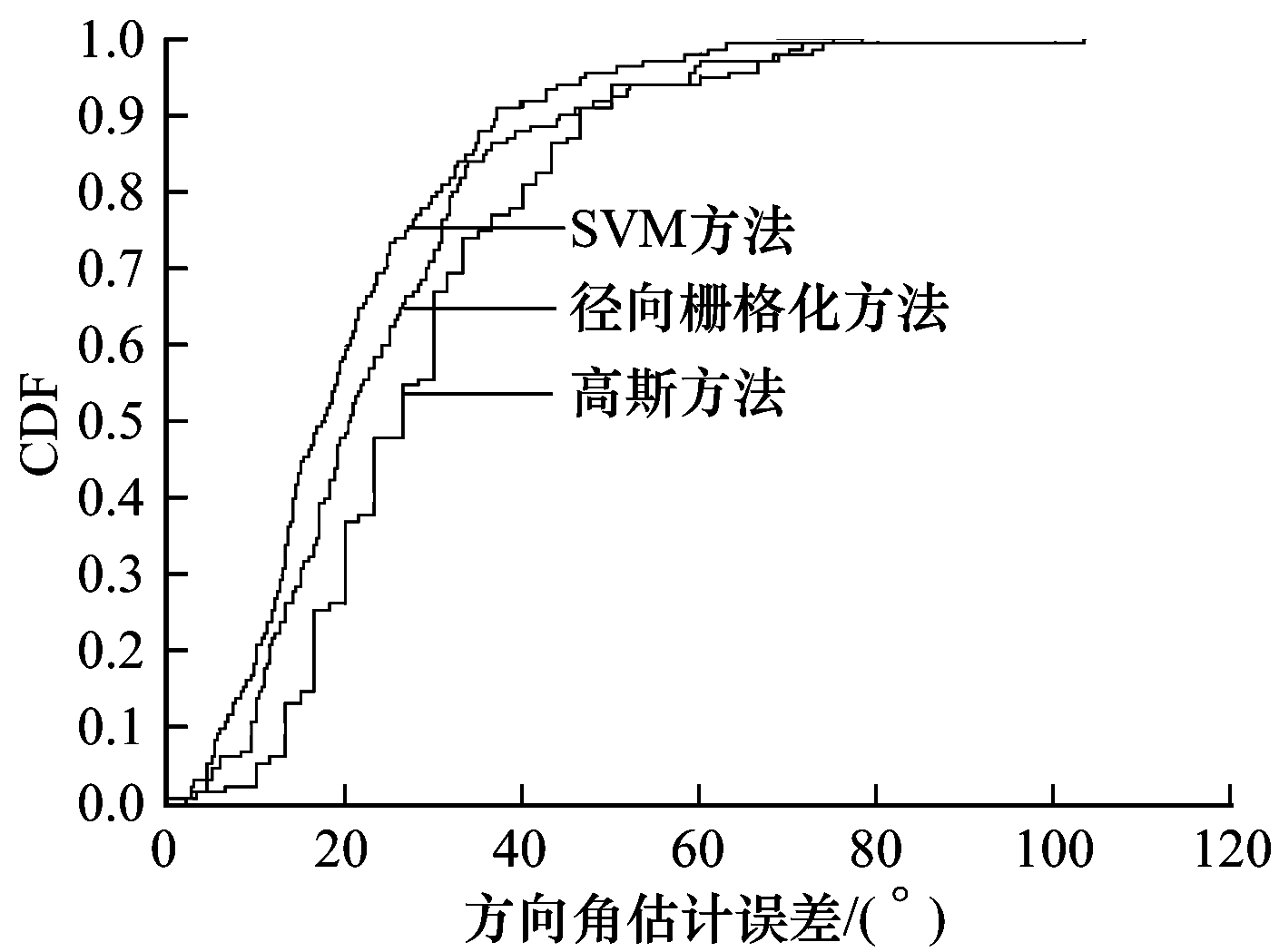本文进一步对多个基站下的各方法性能进行统计和对比。为了保证估计效果,统计各基站的样本量,并剔除样本量不足4 000的基站,对符合条件的130个基站利用3种估计方法进行实验对比,各基站的具体估计误差CDF分布如图 8所示。从图 8可以看出,SVM方法、高斯方法和径向栅格化方法的平均估计误差分别为20.85°、29.03°和24.38°,SVM方法的评估性能明显优于2种对比方法。