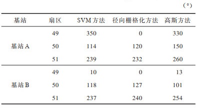 从图 4和图 5可以看出,径向栅格化方法和软间隔SVM方法均表现出优越的性能,方向角估计结果几乎与实际方向角重合,而高斯方法主要指向最大样本数的角度,造成了明显的误差。表 2所示为各方法估计的方向角值。从表 2可以看出,对于基站A,各方法对方向角估计的平均误差从左到右依次为2.3°、6.0°和23.3°,对于基站B,各算法对方向角估计的平均误差从左到右依次为5°、2.3°和15.3°,通过对比可知,径向栅格化方法和软间隔SVM方法的性能均优于高斯方法。