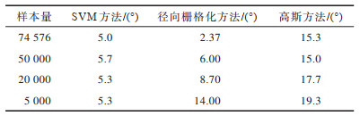 以基站B为例,统计不同样本量下各方法估算结果的平均误差,结果如表 3所示,通过对比可以看出,随着样本量的降低,径向栅格化方法性能显著下降,高斯方法也有一定程度的下降,而SVM方法能够保持相对稳定的准确率,表明其具有较强的鲁棒性。