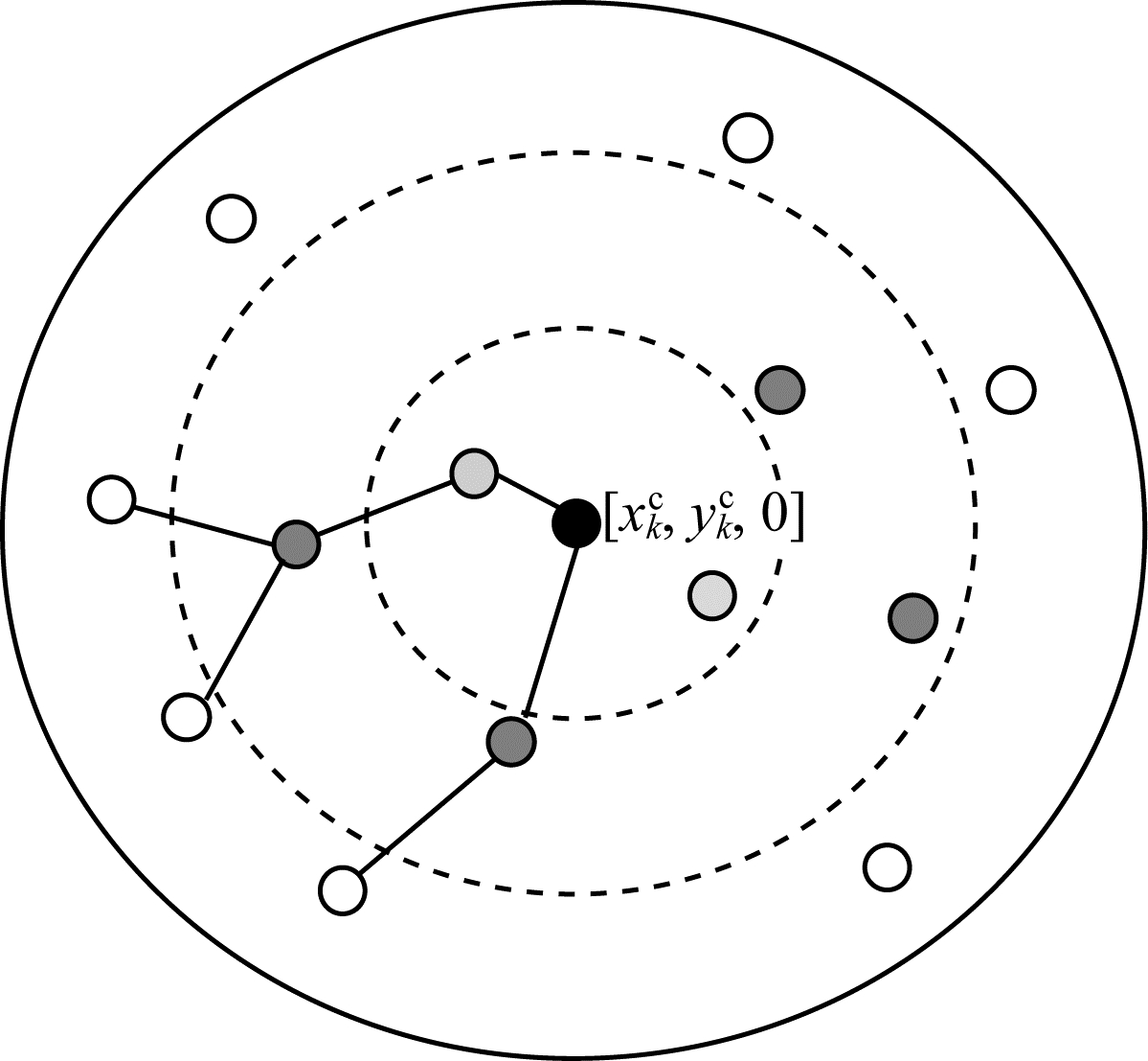 在簇成员向汇聚节点进行数据转发的路由选择上,本文考虑分级多跳路由的方式[21]。分级多跳路由的核心思想是划分节点之间的优先级,首先计算出簇成员节点到汇聚节点的距离,然后根据其距离将簇成员节点由近及远划分为3个等级。数据转发规则为节点数据只能由较远的低级节点发送给较近的高级节点,不可跨级上传。簇内路由的系统模型如图 2所示,图中心的黑色点为该簇的汇聚节点,浅灰色点为一级转发节点,深灰色点为二级中间节点,白色点为三级边缘节点。当开始数据汇集时,簇成员节点通过多跳的方式将数据转发至汇聚节点进行数据汇集。