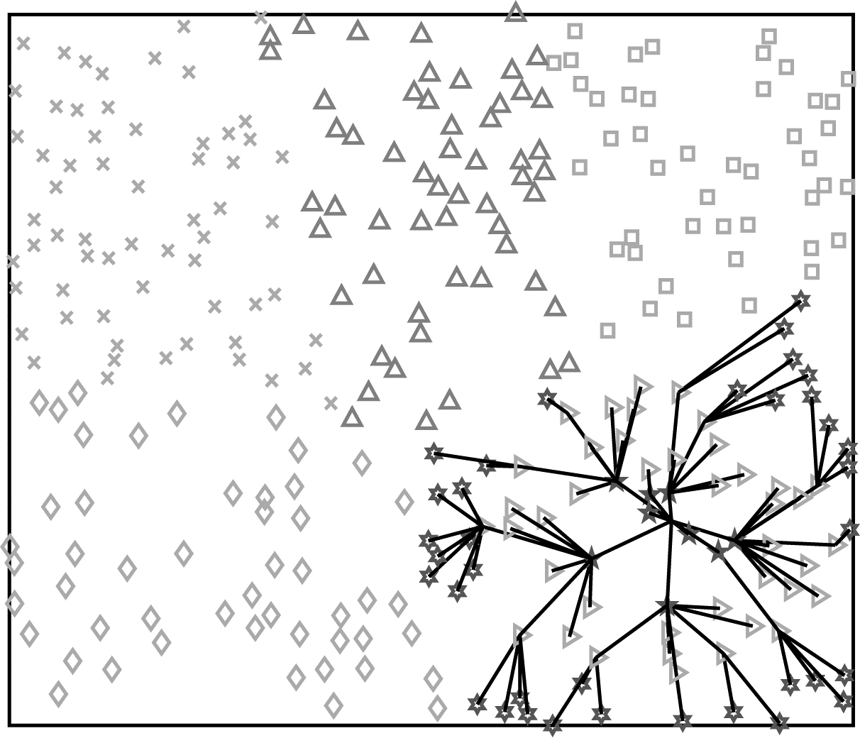 4 仿真与结果分析本节将对比基于强化学习的无人机轨迹规划的性能仿真结果,包括任务完成时间、有效数据率、有效数据收集以及有效数据和能耗之比。首先设置一个W=100 m×100 m的正方形区域,在其中随机均匀分布300个节点,节点的分布情况及分簇多跳结果如图 4和图 5所示(彩色效果见《计算机工程》官网HTML版)。图 4中的黑色点为各簇的簇头节点,图 5展示了簇内节点的分级情况以及数据的多跳传输过程,图中右下角图案为六角星、右三角形、五角星的点分别为文献[21]中簇内分级算法计算所得的三级、二级、一级节点,黑色的线段表示不同级别节点之间的数据传输路径。