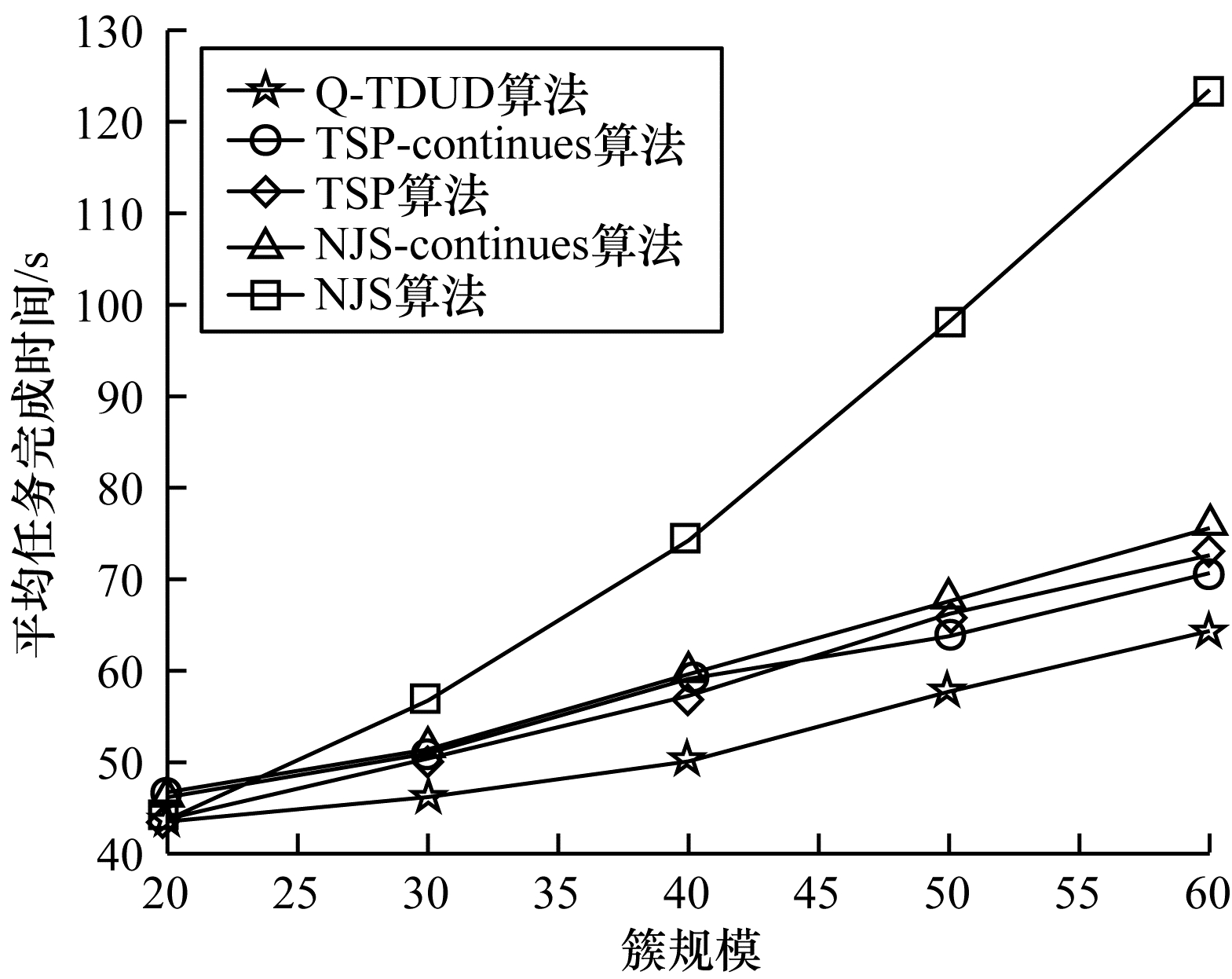 | 图 6 不同簇规模下的平均任务完成时间 Fig. 6 Average task completion times for different cluster sizes | |