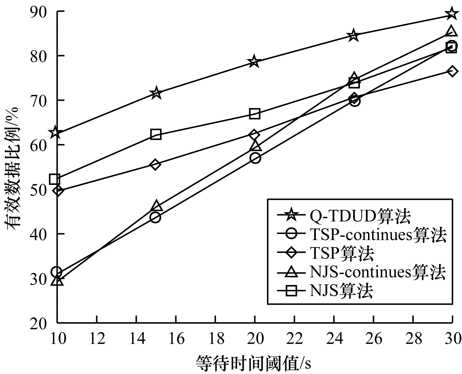 等待时间阈值增大情况下各算法对应的有效数据率变化如图 7所示。等待时间阈值根据式(4)计算得到,图中的横坐标分别是