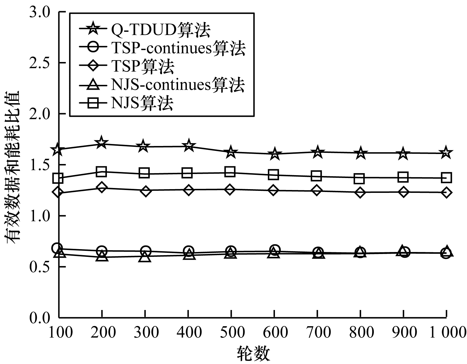 | 图 9 1 000轮内有效数据和能耗比值 Fig. 9 Effective data and energy consumption ratio within 1 000 rounds | |