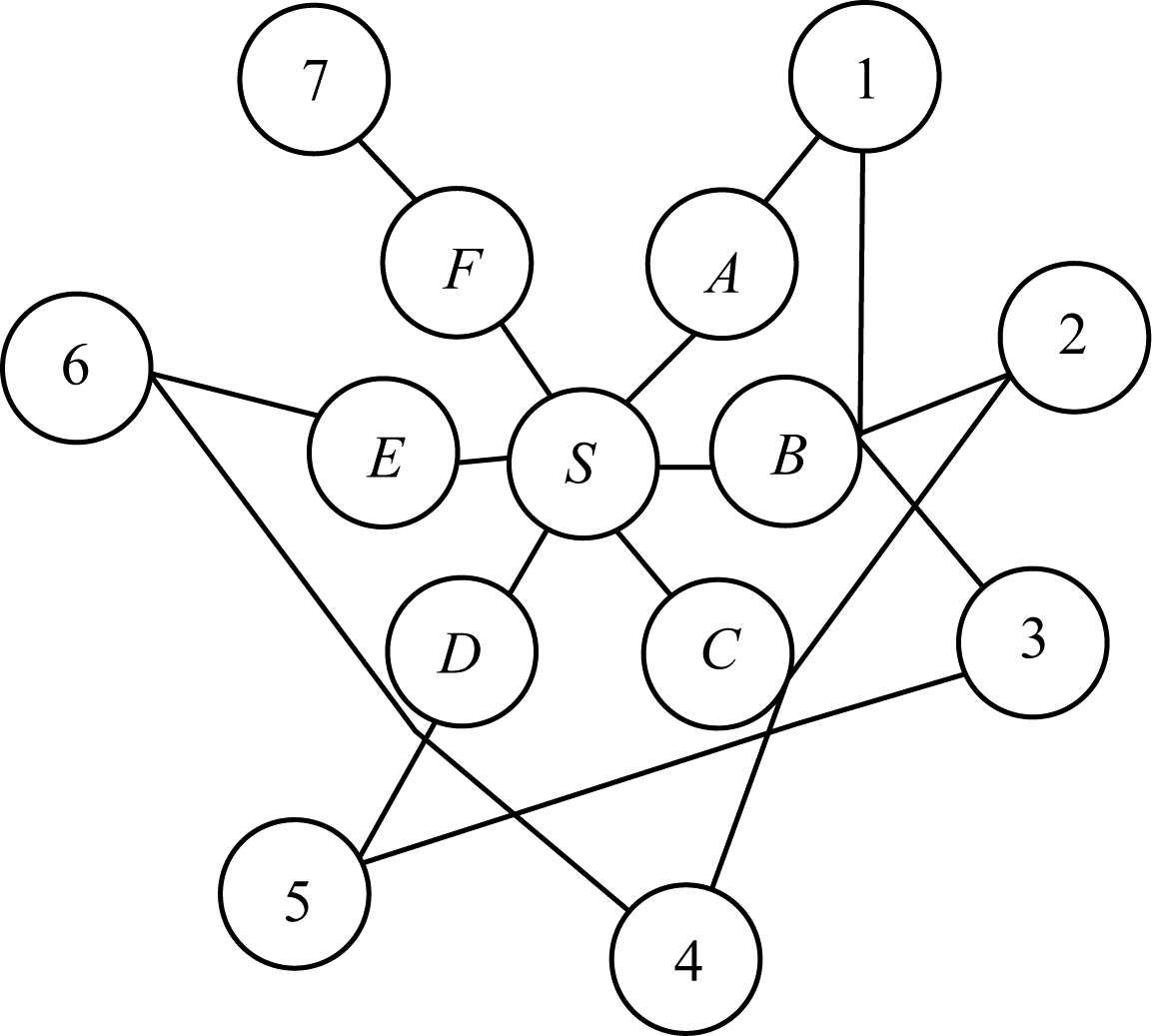 一种网络拓扑状态如图 1所示。针对源节点S,其一跳邻居节点为{A,B,C,D,E,F},二跳邻居节点为{1,2,3,4,5,6,7}。根据OLSR传统的贪心计算方法得到的一种MPR集合为{A,C,E,F},且最小MPR集的大小为4,而实际上源节点S的最小MPR集合为{B,D,F},该算法优点在于快速简单,但是步骤4中根据节点的覆盖数目来确定MPR节点容易带来集合冗余且无法得到最优解的问题。