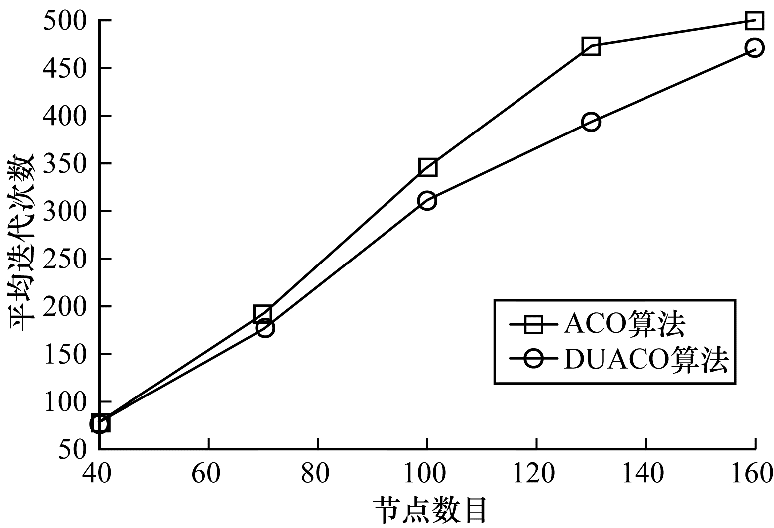 | 图 2 ACO算法与DUACO算法的平均迭代次数对比 Fig. 2 Comparison of the average number of iterations between ACO algorithm and DUACO algorithm | |