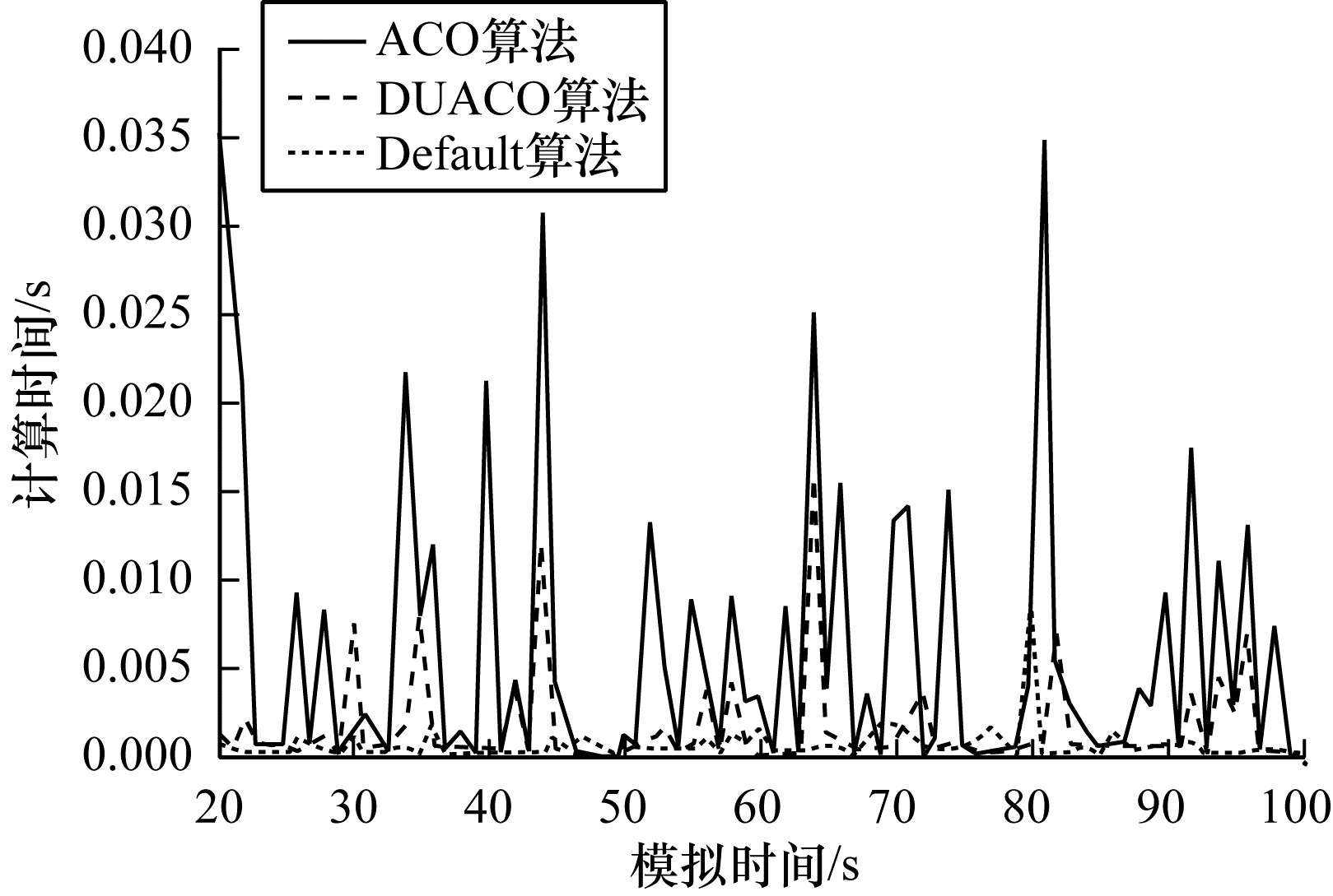 | 图 3 3种算法的节点计算时间与模拟时间的关系 Fig. 3 The relationship between the node computation time and simulation time of the three algorithms | |