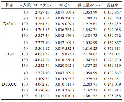 为了验证本文算法的可行性,实验在仿真平台NS3上进行,采用NS3中OLSR协议并将DUACO算法加入到其MPR选择过程中,在不同网络密集程度下比较了默认MPR算法、蚁群优化算法以及DUACO算法的性能。实验选取仿真区域为1 km2,每个节点都采用NS3自带的随机运动-停止模型、节点位置以及移动速度随机生成。多次实验后得到性能稳定性最佳的参数如表 1所示。