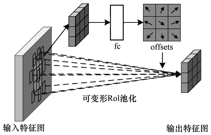 可变形池化原理如图 3所示,以3×3可变形RoI池为例[19],其相比普通RoI Pooling增加了一个offset。可变形池化的具体操作为:首先,通过普通RoI Pooling得到一个特征图,在特征图中加一个全连接层,生成每一个位置的offset;然后,按照式(3)~式(5)得到ΔPij。为了使offset的数据和RoI的尺寸相匹配,需要对offset进行微调。