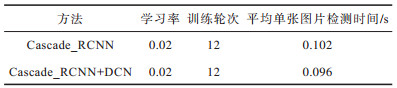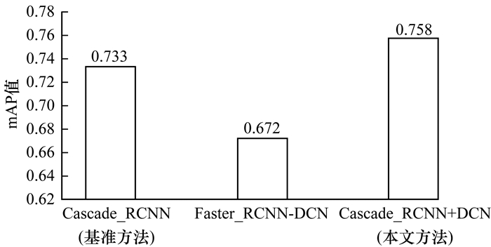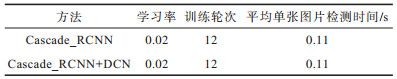 将原始Cascade_RCNN网络作为基准方法,与本文基于可变形卷积网络的目标检测方法进行比较。基准方法使用RoIAlign来提取感兴趣区域的特征,采用平均精度(mAP)作为度量指标。首先,在本文所采集的真实鱼眼图像数据集上进行目标检测,比较基准方法与本文方法的检测性能,结果如图 7所示。从图 7可以看出,本文方法相比基准方法有0.025的mAP性能提升。2种方法训练的学习率、训练轮次和平均单张图片检测时间对比结果如表 3所示。