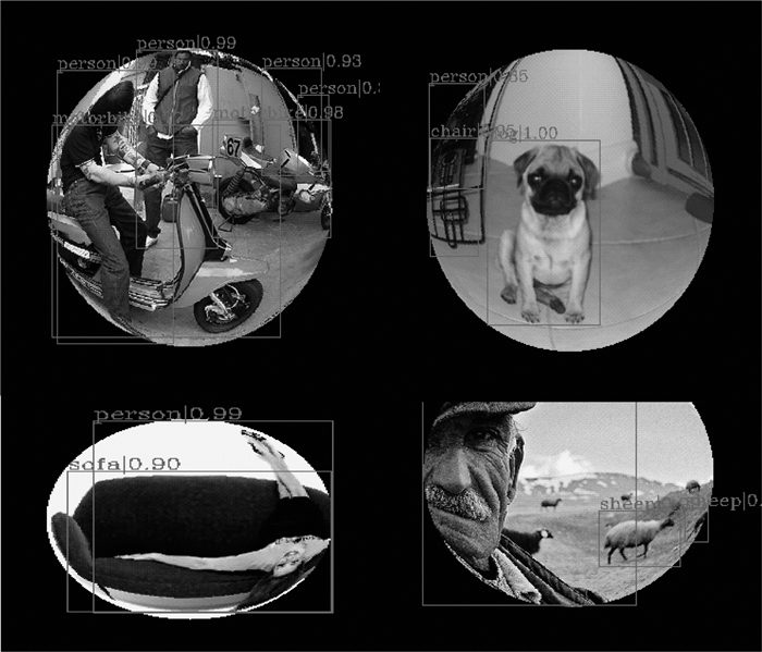 3.1 实验数据集实验中采用最近公开的SFU_VOC_360鱼眼图像数据集,该数据集由著名数据集VOC2012的后处理常规图像生成,包含39 575张用于目标检测的鱼眼图像,共有20个类别,数据集标签如表 2所示,SFU_VOC_360鱼眼图像数据集部分图像如图 6所示。检测目标出现较大的形变,说明鱼眼图像目标检测的难度大于普通图像。