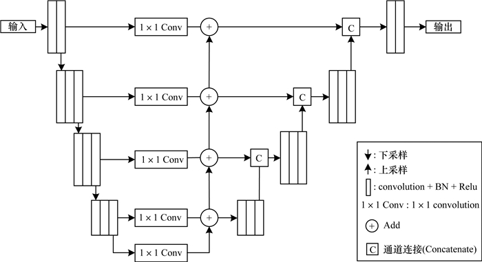 在特征融合的方式上,本文并未使用研究人员通常采用的通道连接(Concatenate)操作。原因在于通道连接操作将大幅提升通道数量,导致参数规模显著增加,该方式耗费成本较大。因此,本文选择FPN[13]的整合方式。对于需要整合的2张特征图,先使用上采样操作(本文中实现的方式为二次线性插值)对较小尺寸的特征图进行调整,以保证尺寸与较大特征图相同,接下来使用1×1卷积对齐2张特征图的通道数,再使用对应元素相加的方式进行整合。相比通道连接(Concatenate)方式,FPN整合方式在整合多尺度语义信息的同时引入的参数数量更少。改进的SEGNET整体结构如图 1所示。
