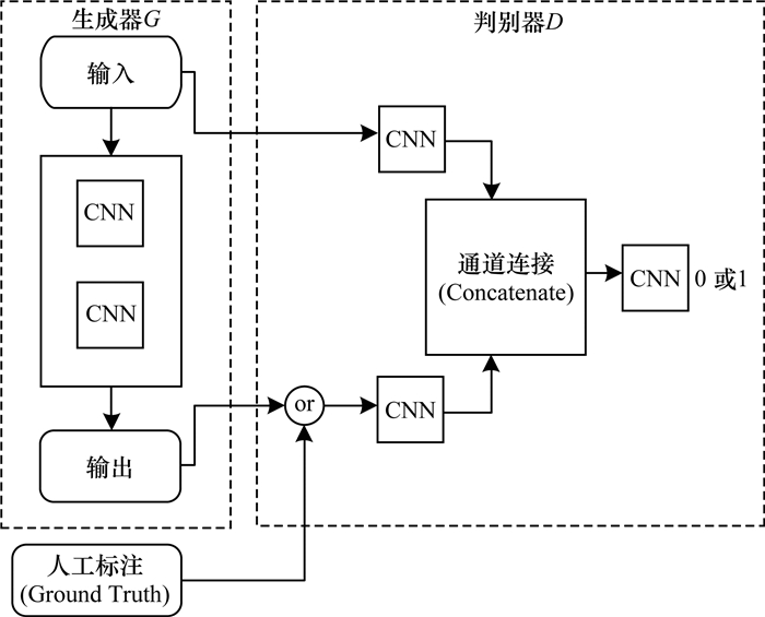 在模型中加入生成对抗网络结构,通过该结构能够较好地拟合未知分布的能力来缓解上述问题[14-17]。具体的方法是将改进的SEGNET网络作为生成器,同时使用卷积神经网络构建一个判别器。随机初始化生成器后,使用生成器的输出与人工标注的真实值构成样本对,并利用该样本对判别器进行训练直至收敛。当判别器收敛时就具备了分辨输入来源的能力,而对于生成器的输出,判别器的响应为0,对于人工标记的真实值,判别器的响应为1。接下来使用训练好的判别器对生成器进行训练,此时生成器的目标在于尽可能骗过判别器,生成器将尽量去模仿人工标注的真实值。对于每一个人工标注的真实值,点与点间的相互关系作为帮助人类区分像素点类别的重要性质而受到关注,则生成器在模仿真实值时也会学习关注点与点间的相互关系。在加入生成对抗网络后,模型的整体结构如图 2所示。