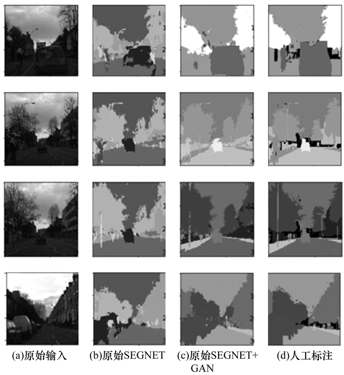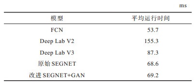 表 3给出了在Tesla V100硬件条件下,5种模型对测试集上的各张图像预测的平均时长。从表 3可以看出,本文改进SEGNET+GAN模型在测试阶段的用时与SEGNET模型较为相近。与DeepLab V2和DeepLab V3模型相比,本文模型在得到更强和相近的分割效果的同时,推理速度更快。这是因为本文模型仅在训练时增加了参数量,在测试时并未有大量参数增加,因此对测试时的推理速度影响较小。