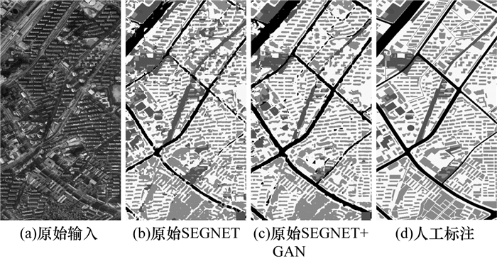 本文对原始SEGNET模型和原始SEGNET+GAN模型的预测结果进行可视化处理,对比结果如图 5所示(彩色效果见《计算机工程》官网HTML版)。从图 5可以看出,原始SEGNET+GAN对道路(黑色)中出现的同属一目标的像素类别不一致现象有所压制,在原始SEGNET预测中出现的建筑被植被包围的错误预测也大幅降低。
