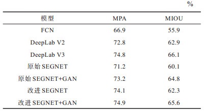 在CAMVID数据集和CCF卫星影像数据集上,以FCN、DeepLabV2[21]、DeepLabV3、原始SEGNET模型和原始SEGNET+GAN模型作为对比模型,验证本文改进SEGNET模型和改进SEGNET+GAN模型的性能优势。