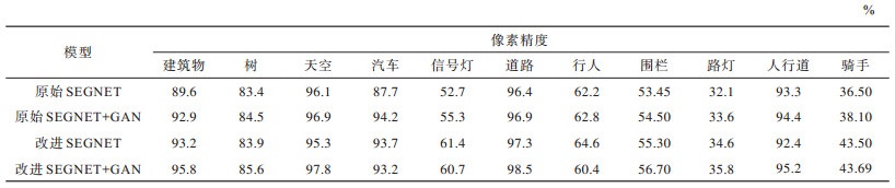 原始SEGNET、原始SEGNET+GAN、改进SEGNET和改进SEGNET+GAN模型在CAMVID测试集上对建筑物、树和天空等11种类别图像分割的像素精度如表 2所示。从表 2可以看出,与原始SEGNET模型相比,在加入GAN结构后,模型对建筑物、树、天空和道路等较大目标类别的像素精确度有明显提升,并且加入自底向上通路的改进SEGNE模型得到的提升效果更加均衡,在各个类别上的像素精度都有较大提升。