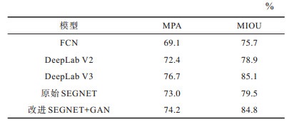 3.2.1 CAMVID数据集上的实验结果7种模型在CAMVID数据集上的MPA与MIOU实验结果对比如表 1所示。从表 1可以看出,改进SEGNET+GAN模型的MPA与MIOU都超越了原始SEGNET模型、FCN模型和DeepLab V2模型,并且达到了与DeepLab V3相近的效果。