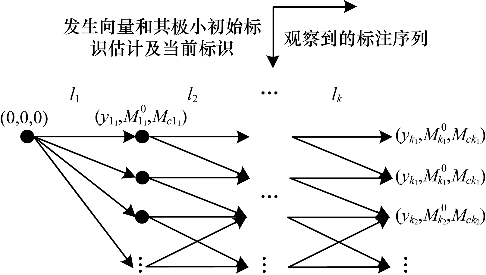 在上述算法中,给定长度为k的标注序列 w=l1l2…lk,目标是找到最小的初始标识估计集合。当观察到第 j个标注时,若发生数向量 yj已经在第 j阶段的某个节点Rj中出现过,则会存在以下两种情形:情形1,